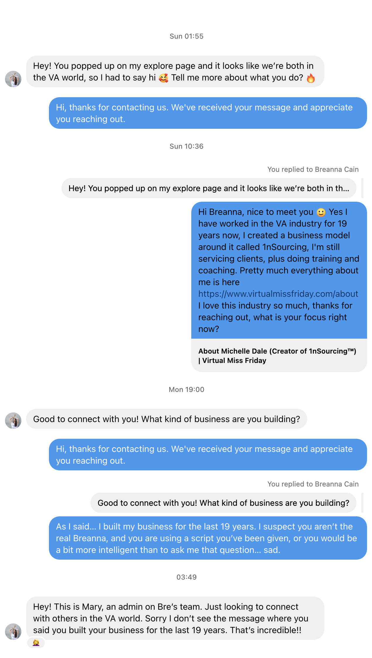 And I don't get it; check out that closing message - if "Breanna" genuinely wanted to "Connect" with other VA's why is she sending "Mary" into her account, and... if that reply was from "Mary" why is she using "Bre's" account to connect...