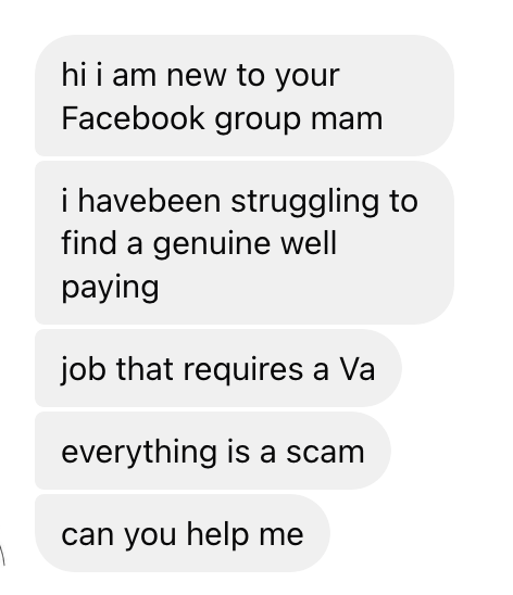 The sadness I feel, that people are joining and posting what is known as "Virtual Assistant Scams" where VA's are being taken advantage of is super-disheartening. Even though we moderate out most of the spammers, some invariably get through.