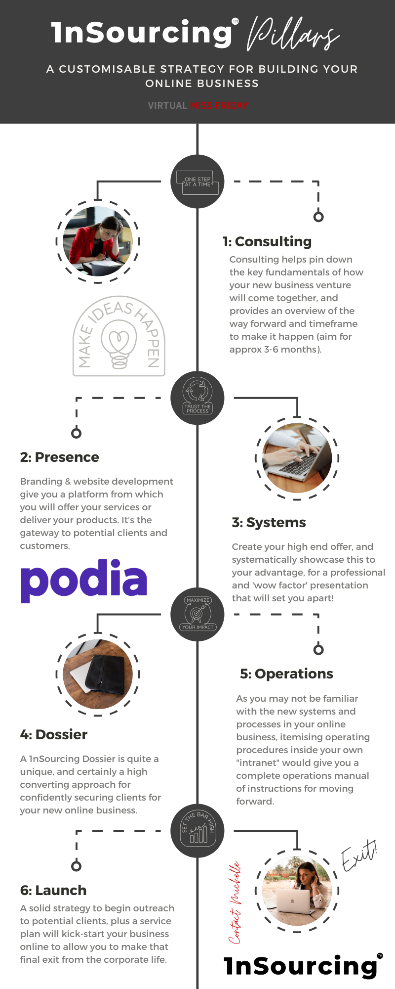 I’ll help you brainstorm, plan and build your online business, centred around YOUR vision. We’ll be using an all-in-one solution I call 1nSourcing to help you transition out of your corporate role, and into something more fitting for your talents.
